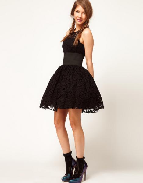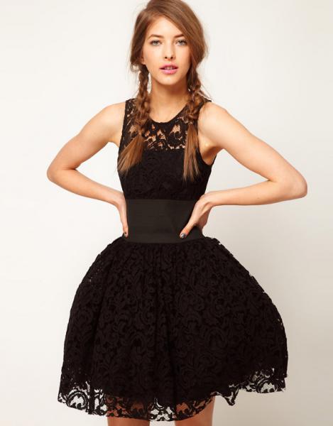 Wide belt decoration black lace puff skirt tank dress
