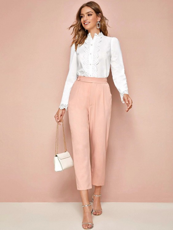 刺繍アイレット トリム スカラップ エッジ ソリッド シャツ