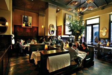 Located just a block from Union Square, Scala's Bistro is adjacent to the historic Sir Francis Drake Hotel. High ceilings with original elaborate design, richly colored floor tiles, a setting inspired by Monet's kitchen, and Scala's Old World atmosphere create a comfortable yet elegant ambiance. An eclectic mix of original murals, rich tobacco tones, gilt mirrors, white linen tablecloths and a semi-open kitchen produces the look and feel of a classic Parisian bistro."